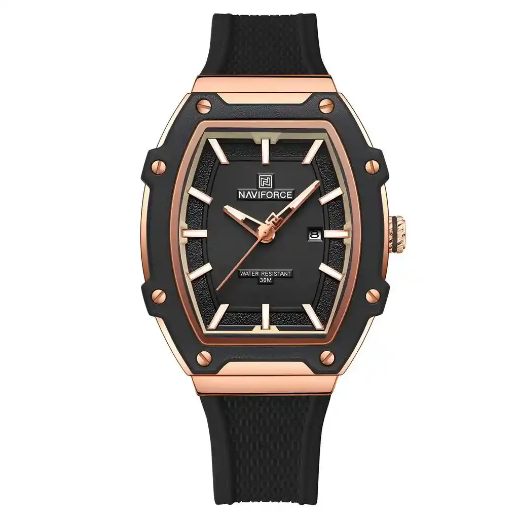 Descubre la elegancia y sofisticación de los relojes **Naviforce**, diseñados para quienes buscan estilo, calidad y funcionalidad en un solo accesorio. Con materiales de primera y un diseño innovador, este reloj no solo complementa tu look, sino que también resalta tu personalidad con un toque de lujo y distinción. Su correa elegante se adapta perfectamente a cualquier ocasión, permitiéndote lucir impecable en todo momento. Más que un simple reloj, **Naviforce** es sinónimo de prestigio y modernidad, ideal para quienes desean destacar con cada detalle. ¡Hazlo tuyo y eleva tu estilo al siguiente nivel! /// El reloj incluye su estuche original y tarjeta de garantía. /// Ficha Técnica Pantalla Análoga Resistencia al agua de 3ATM (solo exposición accidental al agua No ducha, No se puede sumergir, No usar en actividades acuáticas). Tipo de cierre: Hebilla Material de la caja: Aleación de zinc metal Grosor de esfera: 1.2 cm Ancho correa: 2.2 cm Diámetro: 3.6 cm Material de la correa banda: Goma Longitud de La correa: 25 cm ( Ajustable ) Peso neto: 57 g Términos de garantía: Para defectos de fábrica o solicitudes de retracto, es importante revisar el producto inmediatamente al recibirlo y antes de usarlo, ya que no aplicará garantía una vez utilizado. Se dispone de un máximo de 5 días para reportar defectos de fábrica, como piezas faltantes o rotas. En el caso de maquinaria, la garantía cubre tres meses para garantizar su correcto funcionamiento. Para efectuar una devolución, el producto debe ser devuelto en su empaque original, en buen estado, con todos los documentos y partes completas y sin daños.