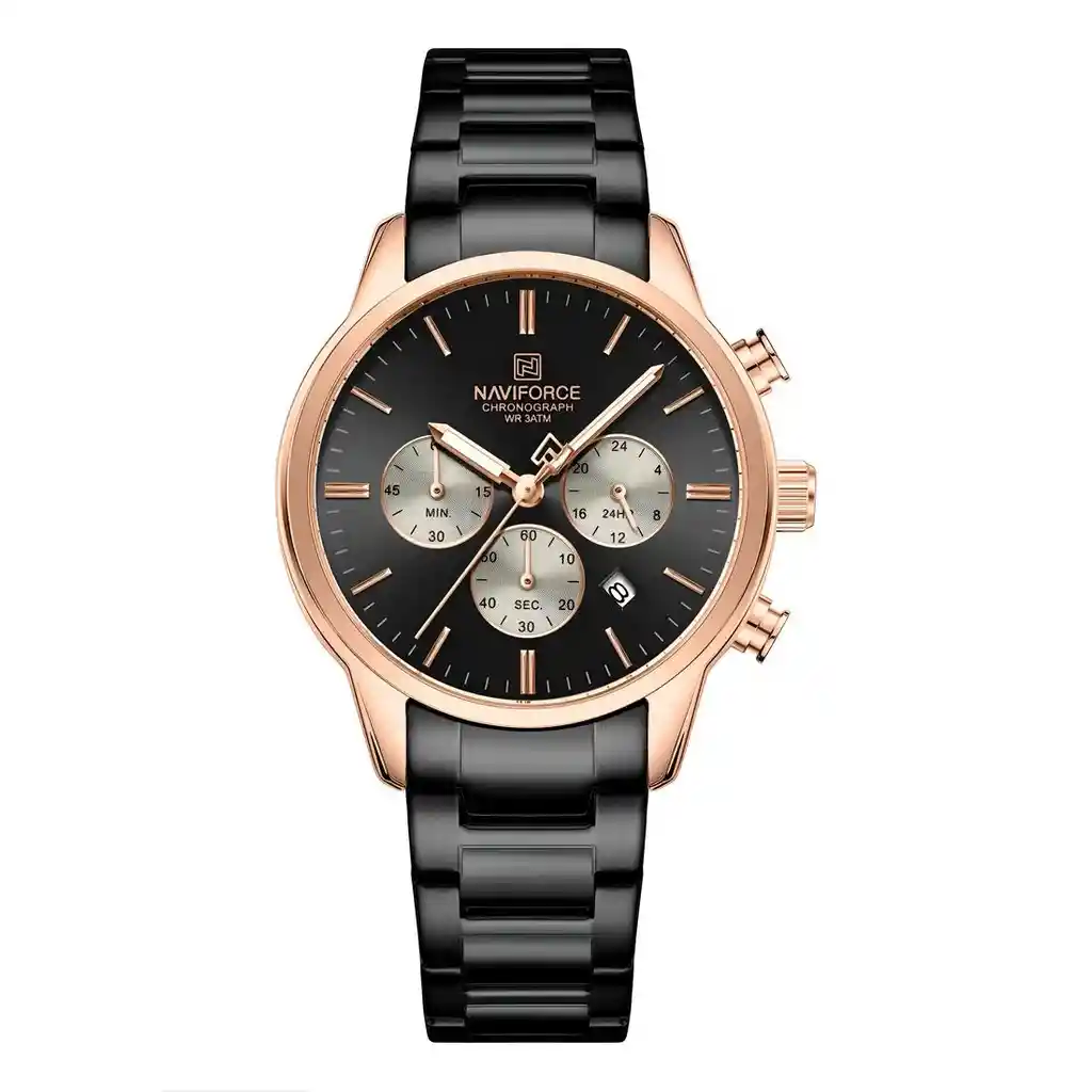 Los mejores relojes te los trae la marca Naviforce con sus sorprendentes estilos que definitivamente te enamoraran. Todos sus diseños son inspirados en la comodidad y satisfacción del cliente, ofreciéndote relojes con materiales de la más alta calidad, estilos innovadores y de cualidades inigualables. El reloj Naviforce es un accesorio indispensable que cumplirá con todas las expectativas que buscas en un reloj, uniendo lo mejor de la moda y destacando tu belleza a la hora de portarlo. /// El reloj incluye su estuche original y tarjeta de garantía. /// Ficha Técnica Pantalla Análoga Resistencia al agua de 3ATM (solo exposición accidental al agua No ducha, No se puede sumergir, No usar en actividades acuáticas). Tipo de cierre: Hebilla Material de la caja: Aleación de zinc metal Ancho de la correa: 2 cm Grosor de la caja: 1.2 cm Diámetro: 4.2 cm Material de la correa banda: Acero Inoxidable Longitud de La correa: 26 cm Peso neto: 120 gr Términos de garantía:_Para defectos de fábrica o retractos: _Por favor revise el producto apenas lo reciba y antes de usarlo. No aplican ley de retracto o defectos de fábrica luego de usar el producto. Se manejan máximo 5 días para reportar defectos de fábrica (por ejemplo, piezas faltantes, rotas, etc). En cuanto a maquinaria se da tres meses de garantía, es decir el buen funcionamiento del producto. Para hacer efectiva la devolución el producto debe devolverse con el empaque original, el cual debe estar en buen estado, incluir todos los documentos y las partes completas y sin daños.