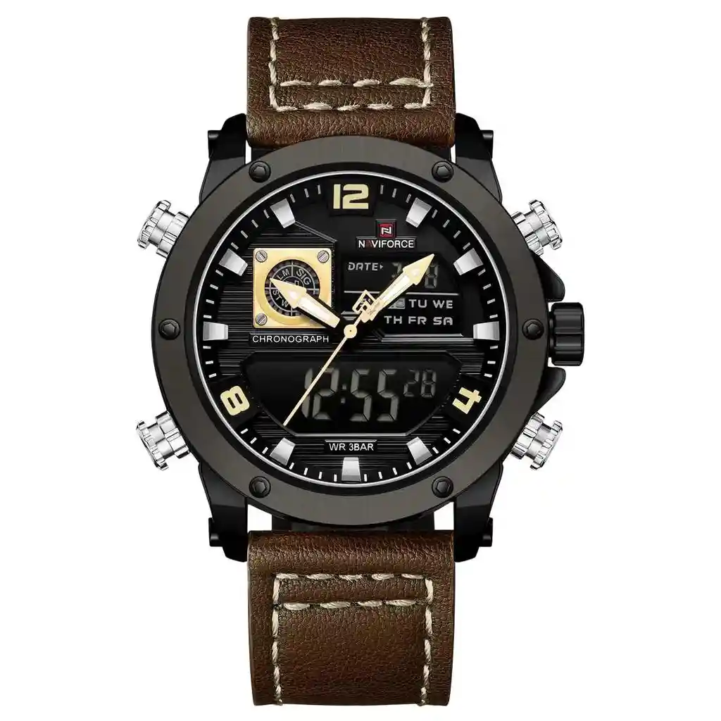 Descubre la elegancia y sofisticación de los relojes **Naviforce**, diseñados para quienes buscan estilo, calidad y funcionalidad en un solo accesorio. Con materiales de primera y un diseño innovador, este reloj no solo complementa tu look, sino que también resalta tu personalidad con un toque de lujo y distinción. Su correa elegante se adapta perfectamente a cualquier ocasión, permitiéndote lucir impecable en todo momento. Más que un simple reloj, **Naviforce** es sinónimo de prestigio y modernidad, ideal para quienes desean destacar con cada detalle. ¡Hazlo tuyo y eleva tu estilo al siguiente nivel! /// El reloj incluye su estuche original y tarjeta de garantía. /// Ficha Técnica Pantalla Análoga Resistencia al agua de 3ATM (solo exposición accidental al agua No ducha, No se puede sumergir, No usar en actividades acuáticas). Tipo de cierre: Hebilla Material de la caja: Aleación de zinc metal Grosor de esfera: 1.6 cm Ancho correa: 2.4 cm Diámetro: 4.6 cm Material de la correa banda: Cuero Longitud de La correa: 26 cm ( Ajustable ) Peso neto: 107 g Términos de garantía: Para defectos de fábrica o solicitudes de retracto, es importante revisar el producto inmediatamente al recibirlo y antes de usarlo, ya que no aplicará garantía una vez utilizado. Se dispone de un máximo de 5 días para reportar defectos de fábrica, como piezas faltantes o rotas. En el caso de maquinaria, la garantía cubre tres meses para garantizar su correcto funcionamiento. Para efectuar una devolución, el producto debe ser devuelto en su empaque original, en buen estado, con todos los documentos y partes completas y sin daños.