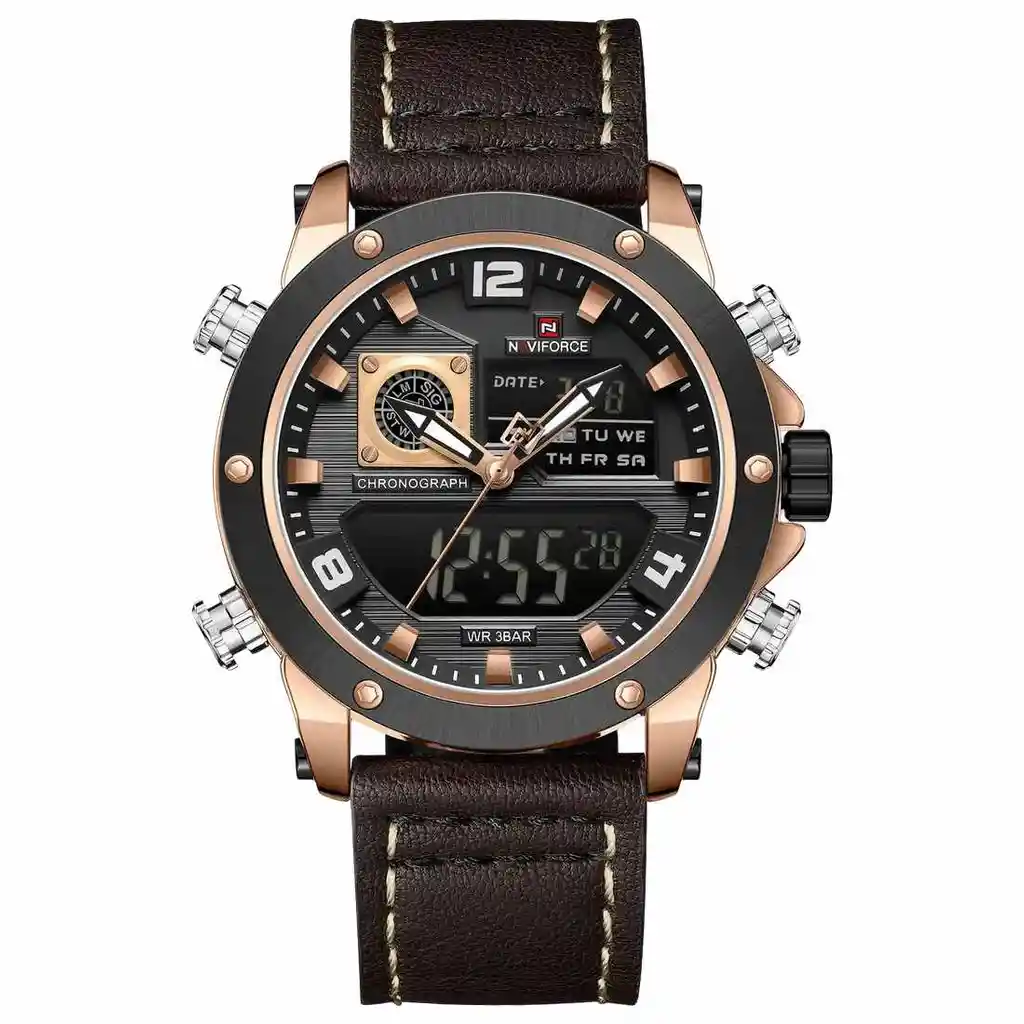 Descubre la elegancia y sofisticación de los relojes **Naviforce**, diseñados para quienes buscan estilo, calidad y funcionalidad en un solo accesorio. Con materiales de primera y un diseño innovador, este reloj no solo complementa tu look, sino que también resalta tu personalidad con un toque de lujo y distinción. Su correa elegante se adapta perfectamente a cualquier ocasión, permitiéndote lucir impecable en todo momento. Más que un simple reloj, **Naviforce** es sinónimo de prestigio y modernidad, ideal para quienes desean destacar con cada detalle. ¡Hazlo tuyo y eleva tu estilo al siguiente nivel! /// El reloj incluye su estuche original y tarjeta de garantía. /// Ficha Técnica Pantalla Análoga Resistencia al agua de 3ATM (solo exposición accidental al agua No ducha, No se puede sumergir, No usar en actividades acuáticas). Tipo de cierre: Hebilla Material de la caja: Aleación de zinc metal Grosor de esfera: 1.6 cm Ancho correa: 2.4 cm Diámetro: 4.6 cm Material de la correa banda: Cuero Longitud de La correa: 26 cm ( Ajustable ) Peso neto: 107 g Términos de garantía: Para defectos de fábrica o solicitudes de retracto, es importante revisar el producto inmediatamente al recibirlo y antes de usarlo, ya que no aplicará garantía una vez utilizado. Se dispone de un máximo de 5 días para reportar defectos de fábrica, como piezas faltantes o rotas. En el caso de maquinaria, la garantía cubre tres meses para garantizar su correcto funcionamiento. Para efectuar una devolución, el producto debe ser devuelto en su empaque original, en buen estado, con todos los documentos y partes completas y sin daños.