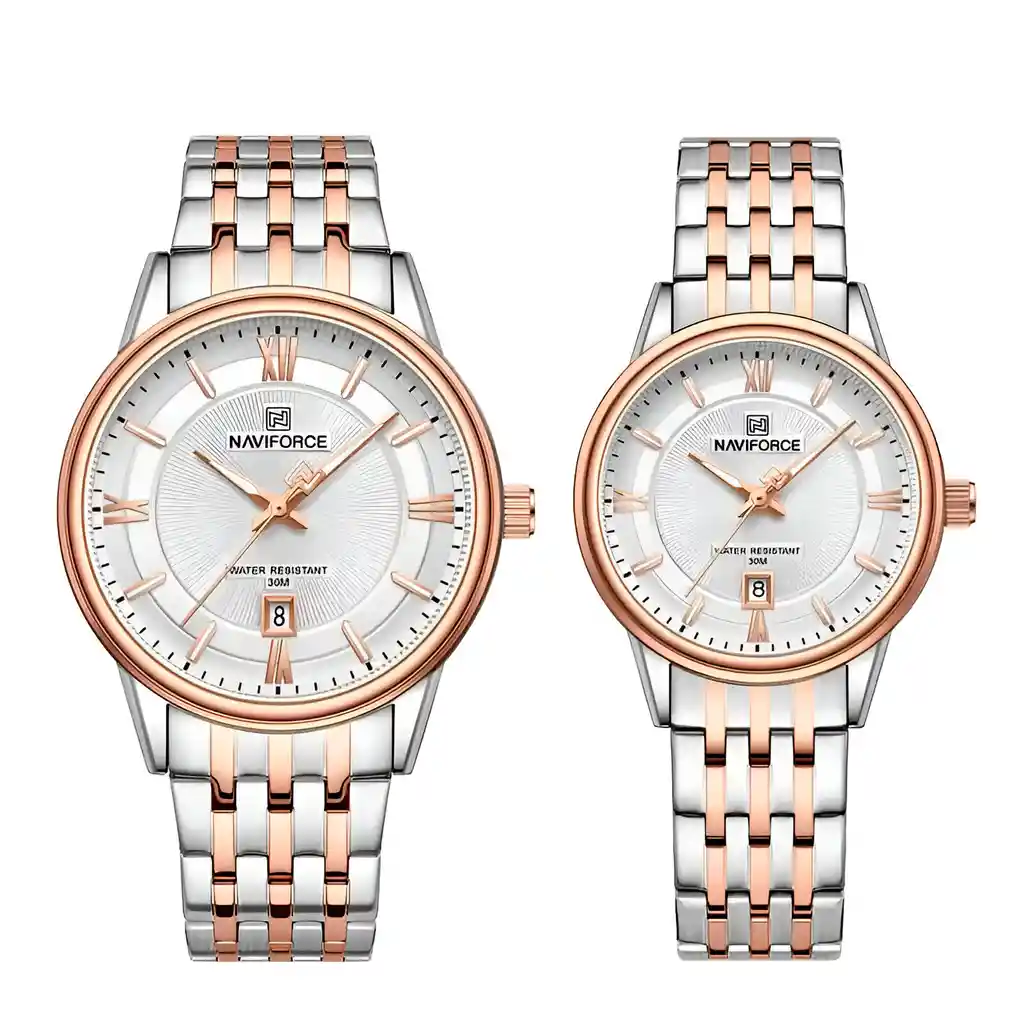 Descubre la elegancia y sofisticación de los relojes **Naviforce**, diseñados para quienes buscan estilo, calidad y funcionalidad en un solo accesorio. Con materiales de primera y un diseño innovador, este reloj no solo complementa tu look, sino que también resalta tu personalidad con un toque de lujo y distinción. Su correa elegante se adapta perfectamente a cualquier ocasión, permitiéndote lucir impecable en todo momento. Más que un simple reloj, **Naviforce** es sinónimo de prestigio y modernidad, ideal para quienes desean destacar con cada detalle. ¡Hazlo tuyo y eleva tu estilo al siguiente nivel! /// La pareja de reloj incluye su estuche original y tarjeta de garantía. /// Ficha Técnica Pantalla Análoga Resistencia al agua de 3ATM (solo exposición accidental al agua No ducha, No se puede sumergir, No usar en actividades acuáticas). Reloj Hombre Longitud total: 245 mm Diámetro de la caja: 40 mm Grosor de la caja: 10.5 mm Resistencia al agua: 30M Reloj Dama Longitud total: 220 mm Diámetro de la caja: 30 mm Grosor de la caja: 9.5 mm Resistencia al agua: 30M Términos de garantía: Para defectos de fábrica o solicitudes de retracto, es importante revisar el producto inmediatamente al recibirlo y antes de usarlo, ya que no aplicará garantía una vez utilizado. Se dispone de un máximo de 5 días para reportar defectos de fábrica, como piezas faltantes o rotas. En el caso de maquinaria, la garantía cubre tres meses para garantizar su correcto funcionamiento. Para efectuar una devolución, el producto debe ser devuelto en su empaque original, en buen estado, con todos los documentos y partes completas y sin daños.