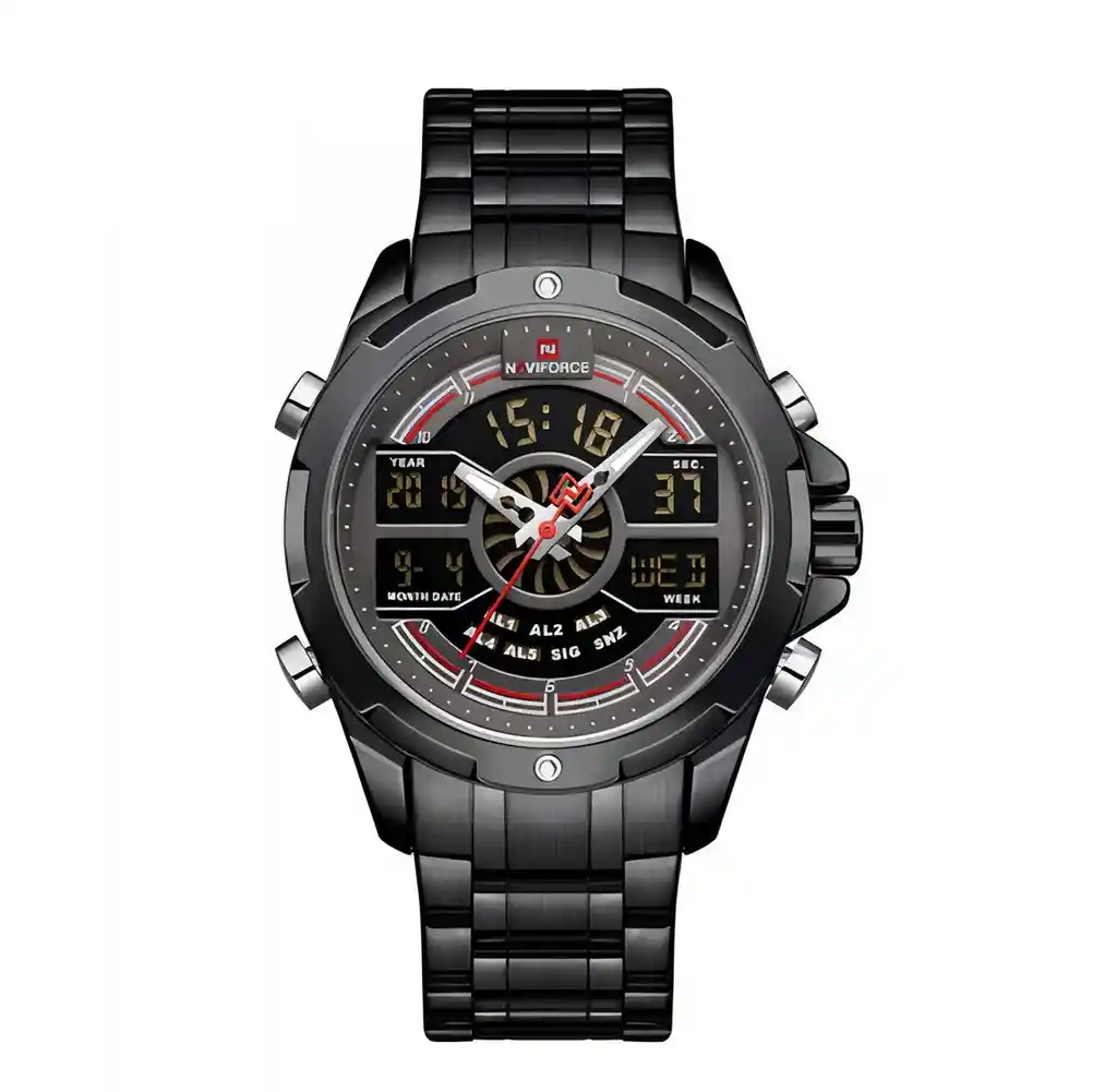 Descubre la elegancia y sofisticación de los relojes **Naviforce**, diseñados para quienes buscan estilo, calidad y funcionalidad en un solo accesorio. Con materiales de primera y un diseño innovador, este reloj no solo complementa tu look, sino que también resalta tu personalidad con un toque de lujo y distinción. Su correa elegante se adapta perfectamente a cualquier ocasión, permitiéndote lucir impecable en todo momento. Más que un simple reloj, **Naviforce** es sinónimo de prestigio y modernidad, ideal para quienes desean destacar con cada detalle. ¡Hazlo tuyo y eleva tu estilo al siguiente nivel! /// El reloj incluye su estuche original y tarjeta de garantía. /// Ficha Técnica Pantalla Análoga Resistencia al agua de 3ATM (solo exposición accidental al agua No ducha, No se puede sumergir, No usar en actividades acuáticas). Tipo de cierre: Hebilla Material de la caja: Aleación de Zinc Grosor de esfera: 1.55 cm Ancho correa: 2.3 cm Diámetro: 4.5 cm Material de la correa banda: Acero Inoxidable Longitud de La correa: 23 cm ( Ajustable ) Peso neto: 110 g Términos de garantía: Para defectos de fábrica o solicitudes de retracto, es importante revisar el producto inmediatamente al recibirlo y antes de usarlo, ya que no aplicará garantía una vez utilizado. Se dispone de un máximo de 5 días para reportar defectos de fábrica, como piezas faltantes o rotas. En el caso de maquinaria, la garantía cubre tres meses para garantizar su correcto funcionamiento. Para efectuar una devolución, el producto debe ser devuelto en su empaque original, en buen estado, con todos los documentos y partes completas y sin daños.