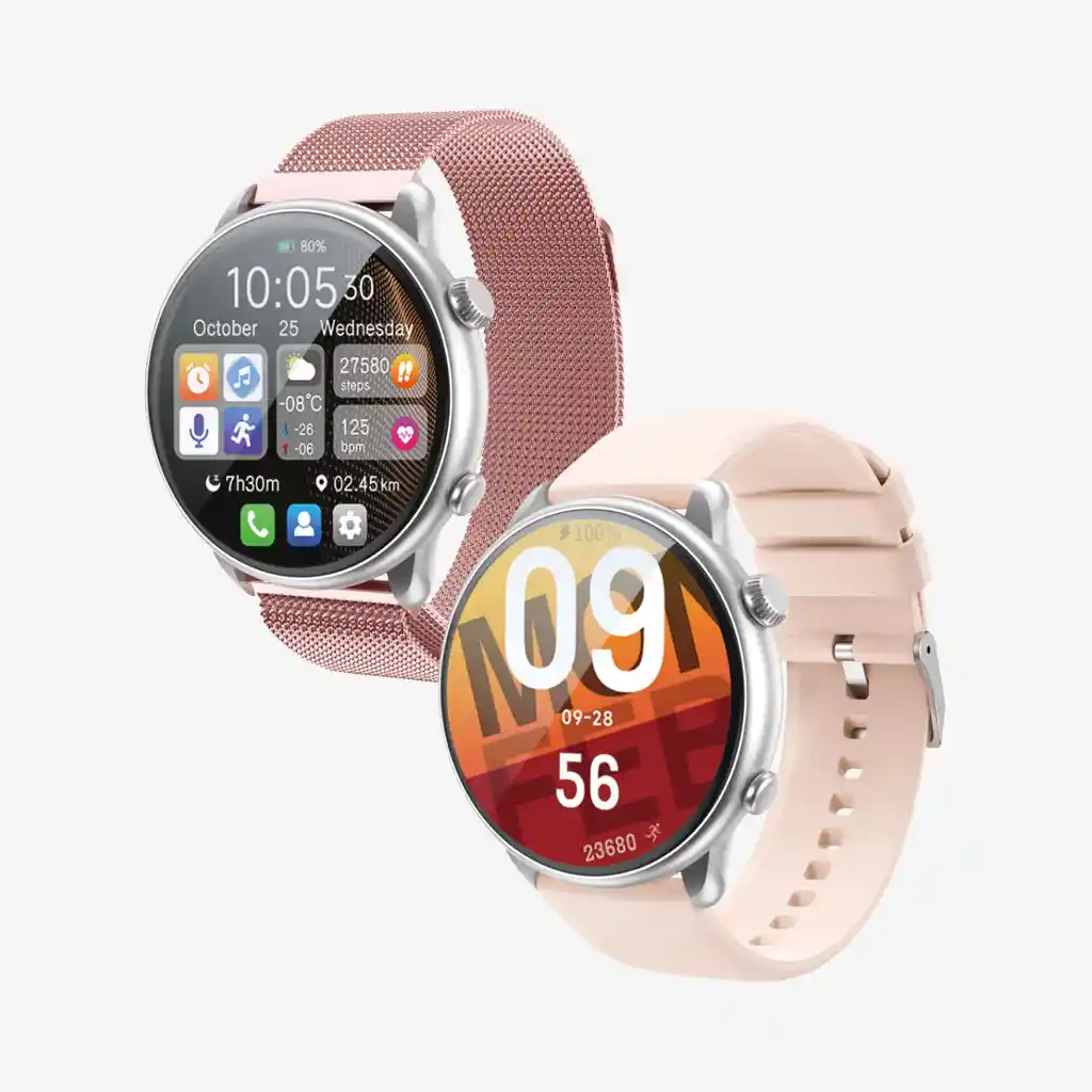 Reloj SmartWatch BO-WA10 Color: Plateado Accesorios: 2 Manilas Rosas 1 Metálica tipo malla y 1 en silicon 1. Pantalla táctil HD de 1,43" de alta definición 2. Resistencia al agua IP68 y múltiples modos deportivos 3. Responde llamadas y ve notificaciones en tu muñeca 4. Monitorea tus ciclos menstruales y tu salud 5. Duración de la batería de hasta 20 días Experimenta la claridad y el estilo con nuestra pantalla táctil HD de 1.43". Revestido en aleación de zinc de primera calidad, este reloj combina elegancia y resistencia. Su clasificación de impermeabilidad IP68 lo hace resistente a salpicaduras y lluvia, ideal para entrenar y para el día a día. Personaliza tu look fácilmente con acceso a más de 100 esferas de reloj con diseño de nubes. Equipado con un sensor inteligente de canal avanzado, este reloj monitorea con precisión métricas de salud clave como la frecuencia cardíaca, brindándole información significativa sobre su bienestar. Alimenta tu pasión por el movimiento con múltiples modos deportivos específicos. El reloj registra de forma inteligente todos tus datos deportivos, ayudándote a analizar tu rendimiento y a alcanzar tus objetivos de fitness. Mantente conectado sin esfuerzo. Recibe notificaciones de llamadas y mensajes, y responde llamadas directamente desde tu muñeca. A pesar de sus potentes funciones, disfruta de una duración excepcional gracias a nuestra batería de larga duración, que ofrece hasta 20 días de autonomía con una sola carga: dedica menos tiempo a cargar y más a disfrutar.