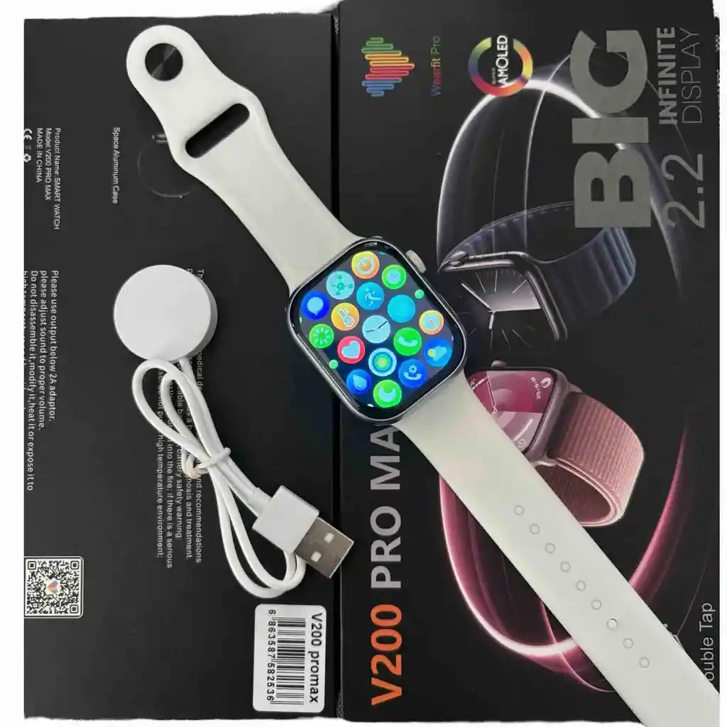 El dispositivo es un reloj inteligente V200 PRO MAX con pantalla de 2.2 pulgadas. Información útil: Pantalla: Grande de 2.2 pulgadas, tipo "Infinite Display". Funciones: Permite realizar y contestar llamadas, notifica mensajes de redes sociales, y cuenta con modos deportivos y podómetro. Salud: Mide signos vitales y esfuerzos físicos. Conectividad: Bluetooth para sincronización con dispositivos móviles. Resistencia: Resistente a salpicaduras, sudor y polvo, pero no es sumergible. Adicional: Incluye función de cámara remota y control de música. Compatible con iPhone y Android