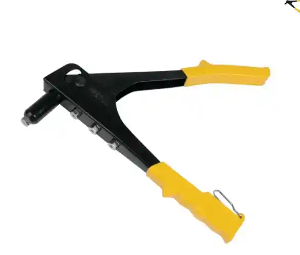 4 Boquillas intercambiables: -Para remaches de 3/32" a 3/16". Longitud de 10". Mangos recubiertos con vinilo para mayor comodidad. Cilindro de cabeza y estructura fabricados en acero templado. Ideal para cancelerías de aluminio, talleres de hojalatería y carroceros. Gancho de seguridad, para retraer las pinzas.