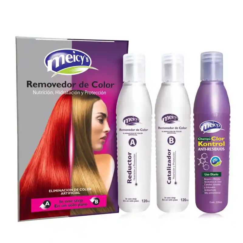 REMOVEDOR DE COLOR Elimina el color artificial son necesidad de usar los productos de decoloración. Las proteínas, componentes esenciales, aportan fuerza para nutrir y proteger los cabellos. No aclara el pigmento natural del cabello. Contiene: - Reductor A x 120 ml - Catalizador B x 120 ml - Estabilizador x 120ml. CORRECCIÓN TOTAL: 1. Dividir el cabello en 4 secciones. Mezcla el paso A y B teniendo en cuenta la proporción 50/50. 2. Depositar en un recipiente platico para facilitar la aplicación con brocha. Iniciar la aplicación por la nuca, tomando mechas delgadas y de manera uniforme. 3. Después de la aplicación dar de 30 a 40 minutos de exposición y activar con calor constante, se recomienda un gorro térmico o climatizado. Verificar cada 10 min. 4. Pasados los minutos de exposición enjuagar el tratamiento con el paso C las veces que sea necesario, luego eliminar el exceso de humedad 100% con el secador. 5. Después de secar, proceder inmediatamente aplicar el nuevo color si la base es la adecuada o si es necesario proceder a una decoloración en cao de que el tono deseado requiera una altura mayor. Nota: Retirar el producto con agua tibia, aumentando el efecto ya que actúa térmicamente. CORRECCIÓN PARCIAL: Para aclarar un color que se ha vuelto demasiado oscuro o cenizo. 1. Mezclar 10gr de A reductor, añadiendo 20-30ml de shampoo. 2. Aplicar la mezcla en la zona deseada dejándola actuar 30 min. 3. Una vez alcanzado el resultado con el removedor de color, lavar abundantemente. Aplicar en la estructura del cabello de manera uniforme el frasco C (aprox 100ml) lavar abundantemente. Aplicar tratamiento Hydromeicy. Características: - Corrige oxidación de cualquier tono. - Remueve y reduce el color de oxidación parcial o totalmente - Remueve rojos, violetas, chocolates, cobres - No aclara el color natural -Fácil aplicación - No maltrata NSCO52338-13CO