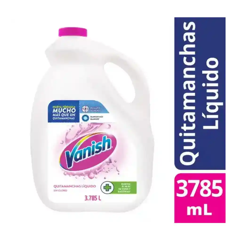 Alarga la vida de tu ropa¹ Blancos más blancos e increíble remoción de manchas Elimina el 99.9% de virus y bacterias* Sin dañar la ropa² ¹Remueve manchas y mantiene los colores en prendas blancas con toque de color de algodón y poliéster con 100 mL de Vanish®en 4L de agua a 40°C durante 60 minutos. Proceda con lavado habitual con detergente. ²No use el producto en terciopelo, lana, seda, cuero, prendas bordadas, estampadas, ni en tejidos elásticos. Mantiene el color de tus prendas aún después de algunas lavadas y con el uso frecuente del producto en condiciones de remojo*S. aureus, S. choleraesuis, P. aeruginosa, K. pneumoniae,Virus del Herpes Humano tipo 1 y Virus Sincitial Respiratorio en condiciones de remojo.PRE-LAVADOPRETRATAR LAS MANCHAS:Agregue 5 mL (1 cucharada) de Vanish® directamente sobre la mancha y déjelo actuar por hasta 5 minutos. Proceda con el lavado habitual con detergente. REMOJO + DESINFECCIÓN:DESINFECTA* LA ROPA SIN DAÑARLA²:Para eliminar las manchas de tu ropa y desinfectarla, agregue 150 mL de Vanish® en remojo con 4 L de agua a 40 °C por 90 minutos. Proceda con el lavado habitual con detergente. No remojar prendas de colores durante más de 90 minutos, ni las blancas durante más de 6 h. LAVADORA:Para eliminar las manchas agregue 100 mL de Vanish® directamente en la lavadora con su detergente habitual. ¹ALARGA LA VIDA DE TU ROPA:Remueve manchas y mantiene los colores en prendas blancas con toque de color de algodón y poliéster con 100 mL de Vanish® en 4L de agua a 40°C durante 60 minutos. Proceda con lavado habitual con detergente.LIBRE DE CLORO (hipoclorito/lejía/lavandina) Increíbles removedores de manchas INCREÍBLES REMOVEDORES DE MANCHAS Peróxido de hidrógeno: libera oxígeno activo para eliminar las manchas de forma segura. Tensioactivos aniónicos y tensioactivos no iónicos: eliminan las manchas de grasa de forma segura. Potencializadores de limpieza POTENCIALIZADORES DE LIMPIEZA Abrillantador óptico: Mejora la blancura de la prenda. Estabilizadores que incluyen fosfonatos: mantienen la eficacia del producto durante su vida útil. Fragancia: proporciona un impulso de aroma. Poderoso agente desinfectante PODEROSO AGENTE DESINFECTANTE Peróxido de hidrógeno: limpia a profundidad la ropa para aumentar la higiene en el lavado Recomendaciones de uso: Antes de utilizar el producto, aplique en una pequeña área no visible del tejido, déjelo actuar por 10 minutos, si no observa ningún daño, enjuague y utilice el producto. No mezclar con otros productos. No trasvasar este producto a botellas y/o envases de uso alimenticio. Lavar las manos después de utilizar el producto. No dejes que Vanish se seque sobre la tela ni saque la prenda al sol. Mantenga el producto en el envase original, cerrado y en un lugar a temperatura ambiente y alejado de la luz solar. 2No use el producto en terciopelo, lana, seda, cuero, prendas bordadas, estampadas, ni en tejidos elásticos. Para mejores resultados, repetir el proceso con tallado. Siga las instrucciones de lavado de las etiquetas de su ropa. Para información del producto o posibles consultas, conserve este empaque. PRECAUCIONES: MANTENER FUERA DEL ALCANCE DE LOS NIÑOS Y ANIMALES DOMÉSTICOS. USE GUANTES ¡CUIDADO! No ingerir. Nocivo para la vida acuática. RIESGOS A LA SALUD: Contacto con los ojos: causa sería irritación, se recomienda el uso de protección ocular. Contacto con la piel: causa irritación moderada. Después de utilizar enjuague las manos con abundante agua, éstas pueden tornarse blancas. El efecto blancuzco es temporal y reversible. Ingestión: puede causar dolor estomacal. Inhalación: bajo las condiciones normales de uso no se conocen efectos adversos.
