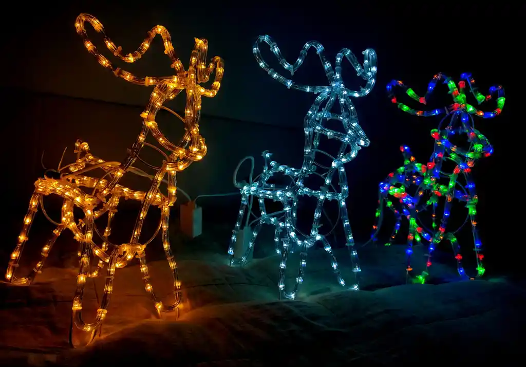 Reno pequeño de navidad en estructura metálica y manguera led de 3 vias, viene con secuencial de 8 movimientos. Figura ideal para decorar interiores y exteriores. Medidas del reno: Alto: 47cm Largo: 34 cm Ancho: 17 cm