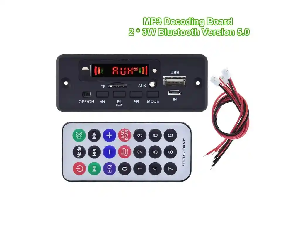 Módulo receptor de audio compatible con bluetooth, cuando el teléfono celular y el módulo compatible con bluetooth coinciden con la condición, los archivos MP3 o APE no destructivos a través de bluetooth compatible se envían al producto del módulo receptor compatible con bluetooth para reproducir, lo que ha ayudado en gran medida a la función de el producto y el entretenimiento. Este producto también es como una placa decodificadora de MP3 ordinaria, reproduce archivos MP3 de disco U o tarjeta TF, así como la transmisión de radio. USB: Conéctese al disco U (soporte máximo de 32 GB, no incluido) Pantalla LED a color: pantalla digital, pantalla roja Módulo receptor de infrarrojos TF: Conéctese a la tarjeta de memoria TF (soporte máximo de 32 GB, no incluido) AUX: interfaz de entrada de audio VOL-: La pulsación corta es la última canción; La pulsación larga es para reducir el volumen. REPRODUCCIÓN/PAUSA: La pulsación corta es el cambio entre pausa y reproducción; La pulsación larga es la estación automática de radio FM. VOL+: La pulsación corta es para elegir la siguiente canción; La pulsación larga es para aumentar el volumen. MODO: Conmutación de USB/TF/FM/ENTRADA DE LÍNEA/VOZ BLUETOOTH Bluetooth IC: compatible con Bluetooth 5.0 Formato de música: MP3/WMA/WAV/FLAC/Mono Potencia: 2*3W, conectado a dos altavoces de 3W Frecuencia de radio FM: 87,5-107,5 MHz. Introducción de funciones de soporte: soporte MP3/USB/TF/LINE IN/FM/BLUETOOTH/Control remoto/DC 12V Acerca de la estructura: tamaño del panel: 93 mm * 36 mm MM, esquina del panel y posición del orificio del tornillo, luego cubra la superficie, la profundidad del tablero es de 33 MM Descripción de la función de grabación. 1. Presione el botón MODE durante mucho tiempo para comenzar a grabar y luego presione el botón MODE durante mucho tiempo para cancelar la función de grabación. 2. Presione la tecla PLAY/PAUSE para reproducir el archivo de grabación. 3. Al grabar, es más necesario conectar un dispositivo de almacenamiento, como un disco U o una tarjeta TF. CON LA COMPRA LLEVAS: 1x REPRODUCTOR AUDIO MP3 JQ-D029BT-A2.1 1x CABLE ALIMENTACION 1x CONTROL REMOTO SIN PILA 2x CABLES PARA LOS PARLANTES