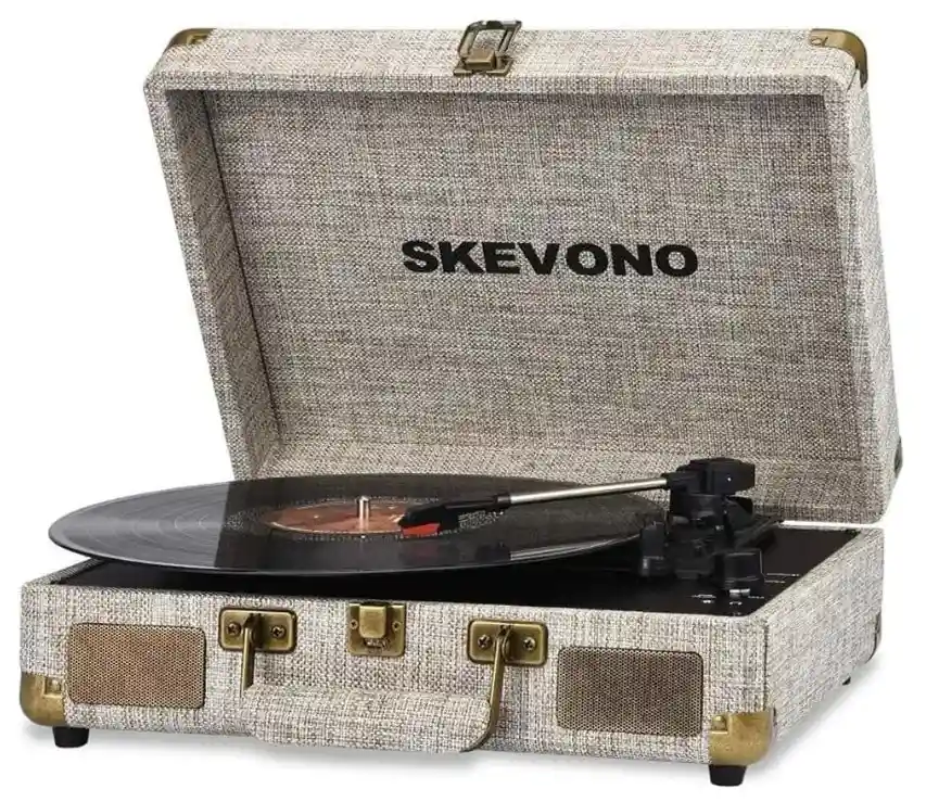 TÍTULO: Tocadiscos portátil tipo maletín Skevono – Vintage, Bluetooth, 3 velocidades, altavoces incorporados, salida RCA y auriculares – Color Beige Mallado DESCRIPCIÓN: Disfruta la magia del vinilo con el encanto clásico del tocadiscos vintage Skevono, un reproductor portátil tipo maletín en hermoso color beige mallado, perfecto para darle un toque retro y elegante a cualquier espacio. Su diseño compacto y fácil de transportar lo convierte en la opción ideal para llevar tu música a reuniones, estudios, dormitorios o cualquier lugar donde quieras crear ambiente. Este modelo combina estilo y funcionalidad, ya que incluye Bluetooth inalámbrico, permitiéndote reproducir música desde tu celular o tablet sin necesidad de cables. Además, sus altavoces estéreo incorporados ofrecen un sonido claro y agradable sin depender de sistemas externos. El Skevono reproduce discos de 3 velocidades (33, 45 y 78 rpm), lo que te permite disfrutar tanto tus vinilos clásicos como tus piezas más recientes. También cuenta con salida RCA y puerto para auriculares, dándote opciones de escucha privada o conexión a equipos adicionales si lo deseas. Su panel de control es sencillo e intuitivo, con perillas de selección, control de volumen y función de parada automática, ideal para cuidar tus discos y disfrutar una experiencia cómoda en todo momento. Un regalo perfecto para amantes del vinilo, coleccionistas, decoradores y quienes buscan un objeto moderno con esencia retro. Características destacadas: Diseño vintage tipo maletín en color beige mallado Conexión Bluetooth para reproducir música desde dispositivos móviles Altavoces estéreo integrados, sonido claro sin equipos adicionales Reproduce 33, 45 y 78 rpm Salida RCA y jack para auriculares Fácil de transportar y muy decorativo Ideal para crear ambientes cálidos en reuniones y espacios personales Contenido del paquete: Tocadiscos portátil Skevono Cable de alimentación Manual de usuario Garantía del vendedor: 20 días por defectos de fábrica. No aplica en caso de mal uso, golpes, humedad o manipulación inadecuada. Es necesario conservar el empaque y la factura de compra.