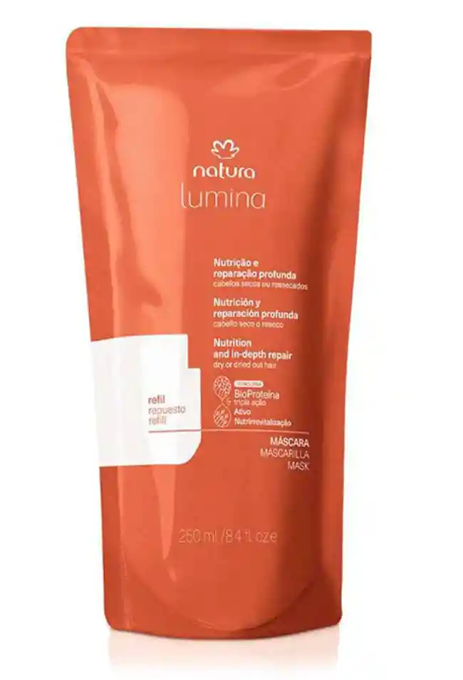 Hasta 2x más reparación con actuación inmediata y progresiva en todas las capas del cabello ¡La línea Lumina para cabello seco o reseco ha cambiado! Ahora tu Sistema de Nutrición y Reparación Profunda tiene nuevos empaques y aún más tecnología para cuidar tu cabello. Tecnología: Bio Proteína triple acción+ activo nutri revitalización Exclusiva combinación de activos queactúan en la reparación inteligente delos daños internos y reparación externa de la fibra capilar. Promueven larecarga profunda de nutrientesesenciales, repara y fortalece el pelo.Cabello nutrido y saludable desde la 1ª aplicación. Activo nutri revitalización: Compuesto por la molécula de Hydroxyethyl Urea que posee alta afinidad con la fibra capilar y penetra a través de la cutícula para promover reparación y fortalecimiento del cabello.
