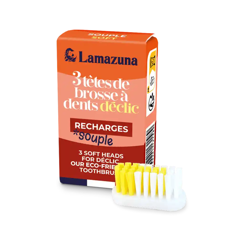 Si te has estado cepillando los dientes con el cepillo de dientes de La Mazuna, luego de 3-4 meses, ¡es hora de que cambies el cabezal de tu cepillo de dientes! ¡Simplemente retira el viejo cabeza y coloca uno nuevo! Este set de repuestos incluye 3 cabezales de cepillo de dientes para cepillo de dientes de cabezal reemplazable La Mazuna. ¡Mantén el mango, solo cambia la cabeza! Las cerdas de su cepillo de dientes se desgastarán después de unos tres o 4 meses. ¡Solo tendrás que empujar su cabezal y listo, ya tienes un cepillo de dientes nuevo sin generar casi nada de residuos, ya que sus cerdas viejas las podrás poner en el reciclaje o en la ecobotella¡ ¿Cómo se usa? Cada 3-4 meses será el momento de cambiar el cabezal por uno nuevo, así que basta solo con presionar la parte posterior de la cabeza vieja para extraerla y reemplazarla por una nueva. ¿Porqué es ecológico? por que a diferencia de un cepillo de dientes corriente desechable, acá se reduce el residuo a solo las cerdas, ya que el mango te durará de por vida. Además el 98% de cada mango está compuesto por una poliamida derivada del aceite de ricino y no del petróleo. El color lo da tinte vegano. Todo se fabrica en Francia, incluso el molde con lo que se incentiva el diseño y desarrollo de nuevos productos útiles e innovadores con pago justo a sus trabajadores. Cada cabezal consta de una base de ABS (acrilonitrilo butadieno estireno), un termoplástico con excelente resistencia a los golpes y a la humedad. Las cerdas están hechos de nylon que es reciclable o pueden ir en la ecobotella.