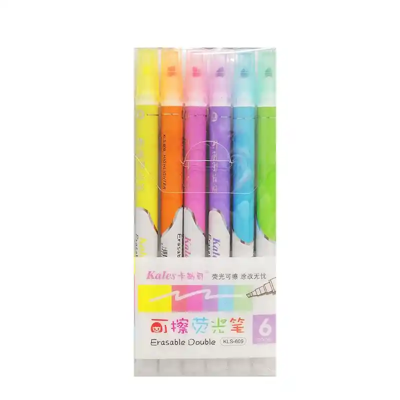 Resaltador Con Punta Borrable X 6 Und. Los bolígrafos borrables tienen 2 extremos, el extremo de la punta del cincel puede dibujar un resaltado amplio o un subrayado fino, una línea gruesa de otras marcas como desee. El final del borrador puede borrar la marca de los resaltadores para mantener su página limpia. FUNCIÓN BORRABLE Los resaltadores borrables le permiten resaltar pero dejar espacio para errores, borrar y reescribir repetidamente sin tener que borrar y mantener su documento limpio o dañar documentos. AMPLIAS APLICACION Use el rotulador resaltador borrable ligero para enfatizar notas importantes en libros de texto en el estudio, para enfatizar información en documentos e informes en el trabajo o para llamar la atención sobre eventos especiales, citas y presupuestos en casa. CARACTERÍSTICAS -Bilateral -Tipo: Agua -Tipo de punta: Biselada.