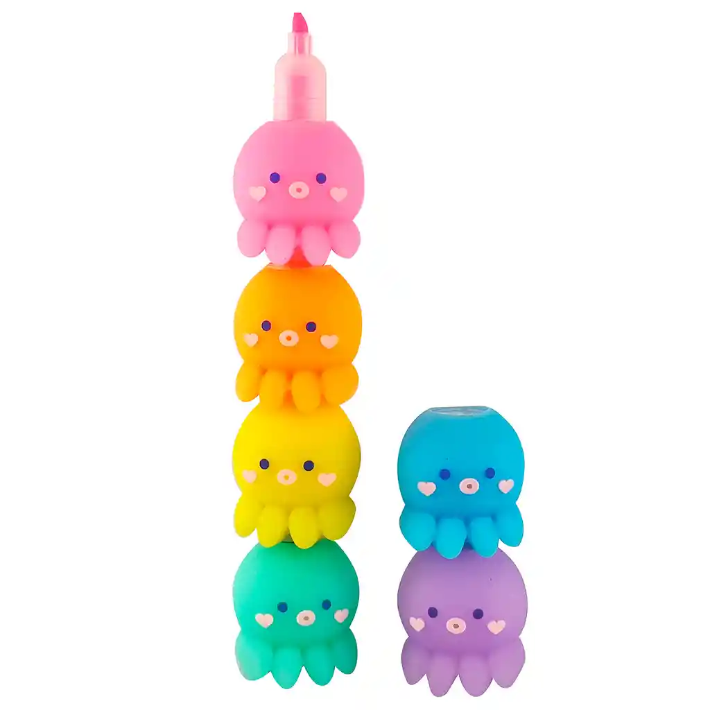 Resaltadores, Estuche X 6 Unds Con Diseño De Pulpo Puntas biseladas Todos los pulpos son apilables y cabe perfectamente en cualquier cartuchera Presentación en caja plástico transparente Fáciles de cargar, los puedes llevar a todas partes Ideales para uso en el estudio y en la oficina Diseños exclusivos y ergonómicos, resaltar cosas importantes y frases en tus libros preferidos y agendas. No tóxica. Excelente calidad