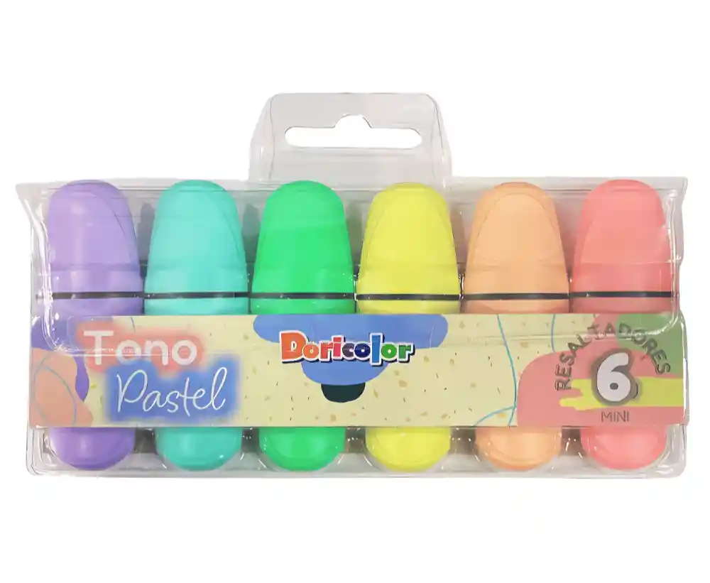 Los Resaltadores Mini Pastel Doricolor X6 son ideales para quienes buscan resaltar información con colores suaves y elegantes. Estos resaltadores cuentan con una punta biselada que permite trazos de diferentes grosores, adaptándose a diversas necesidades de escritura y subrayado.