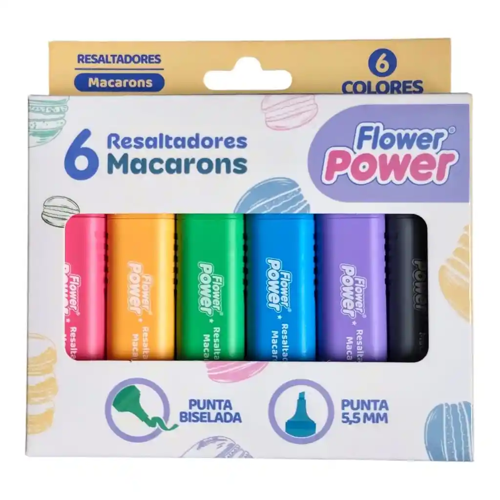 *Es una invitación a explorar la creatividad con suavidad y estilo. *Esta colección Flower Power presenta una combinación de colores pastel que transmiten armonía y frescura, diseñada para quienes valoran los detalles delicados en cada trazo. *Cada caja incluye 6 resaltadores que unen funcionalidad y diseño en perfecta armonía. Características *Cada resaltador cuenta con una punta de 5,5 mm y una punta especial que ofrece 3 diferentes grosores, permitiendo adaptarse a distintas necesidades de trazo. *Su tinta, a base de agua, ofrece un trazo ligero que fluye con suavidad, aportando precisión y confort en cada movimiento. *La variedad de grosores abre la posibilidad de crear líneas sutiles o más marcadas sin perder la elegancia del acabado pastel. *La caja incluye 6 resaltadores Flower Power Primavera Macarons.