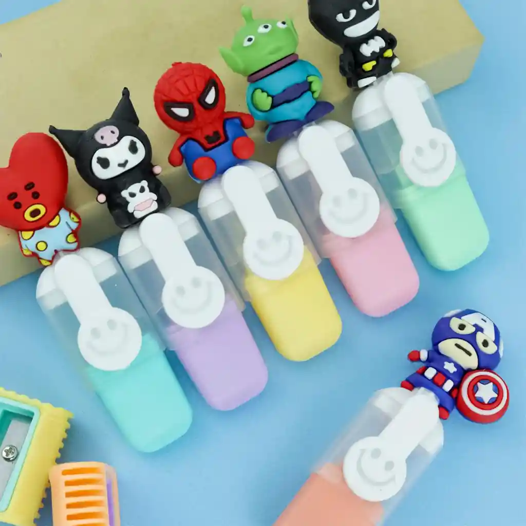 Resaltadores Sanrio, Spiderman, BTS21 • Incluye 1 estuche con 6 resaltadores • Diseño: Kuromi, Spiderman, Tata, Batman, marciano, capitán américa • Tonos tintas: rosa, naranja, amarillo, verde, azul, morado *Debido a factores como la luz y las pantallas, existen ligeras diferencias entre el producto y la imagen*