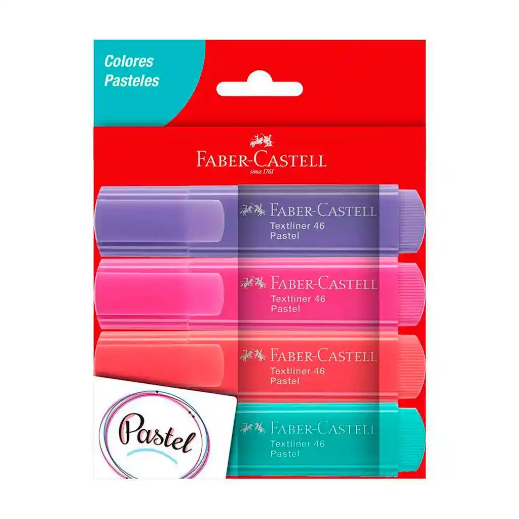 resaltadores pastel faber castell textliner 46 x 4 unidades. Somos Bocetos Papelería. Empresa Santandereana, ubicados en Bucaramanga, con más de 35 años en el mercado, orgullosos de ser distinguidos en el ámbito comercial, por cumplir a cabalidad nuestra mayor política: brindar siempre y en todo momento una experiencia de satisfacción total a las necesidades de nuestros clientes. -cuenta con una punta especial que permite tres anchos de trazo diferente - tinta a base de agua - conservaren posición horizontal -puede marcar o resaltar en cualquier tipo de papel -incluye los colores pastel lila, aguamarina, rosado y coral.