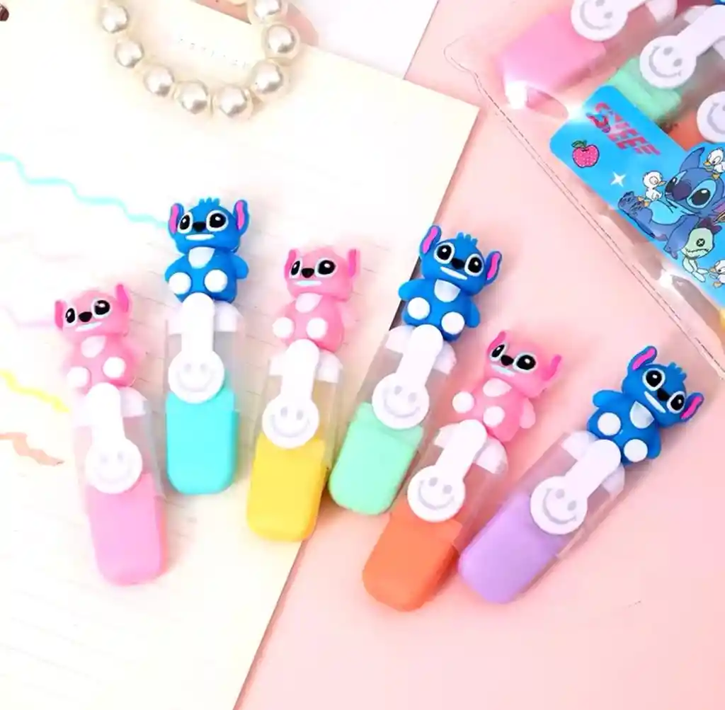 Resaltadores Stitch Y Ángel • Incluye 1 estuche con 6 resaltadores • Tonos tintas: rosa, naranja, amarillo, verde, azul, morado *Debido a factores como la luz y las pantallas, existen ligeras diferencias entre el producto y la imagen*