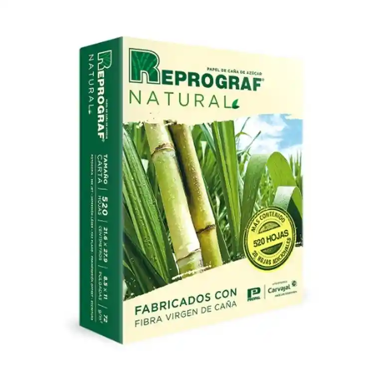 Resma de Papel Natural Tamaño Carta - Marca Reprograph. Ideal para impresión Láser o Inkyet. Papel con menor proceso, dándole el color natural de la fibra de caña. Sello Ambiental Colombiano. Empresa Carvajal.