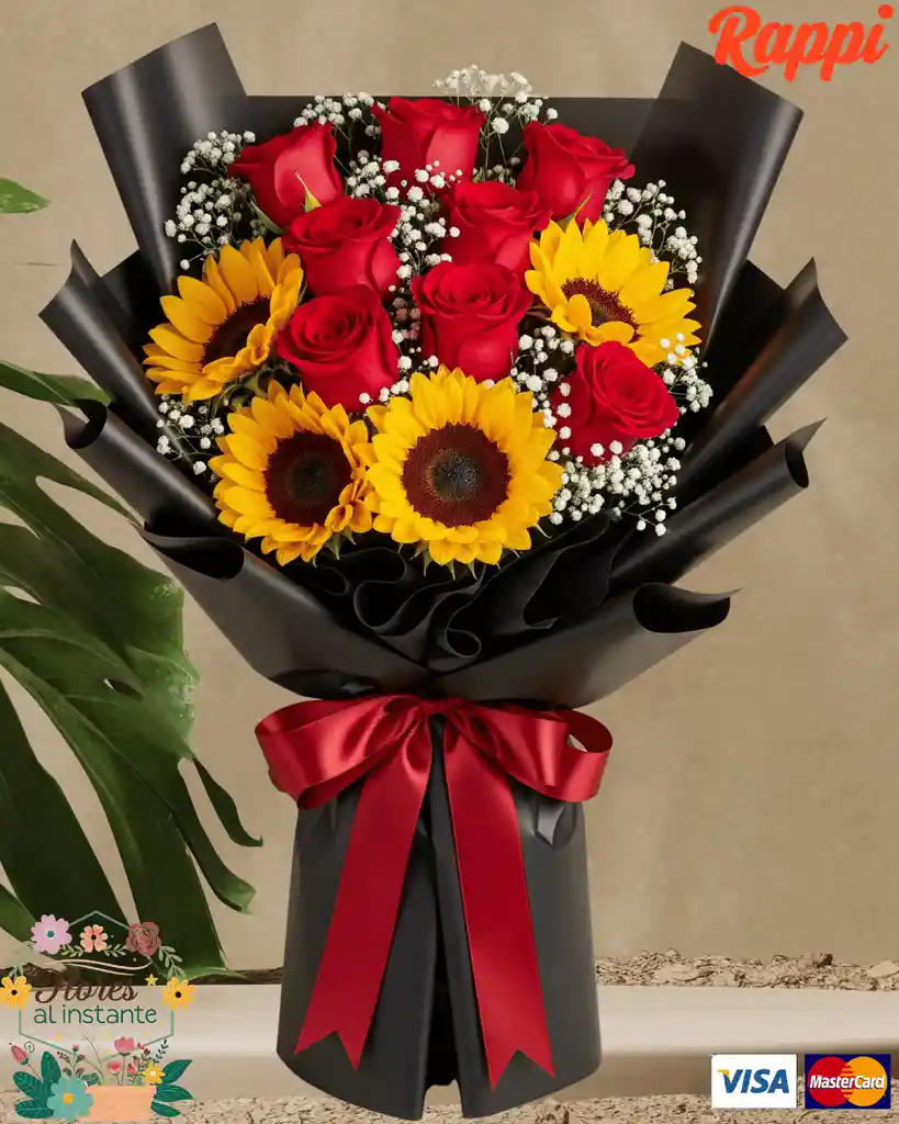 Un bouquet espectacular que combina la energía de 4 girasoles grandes y frescos con la pasión de 10 rosas rojas. Envuelto en un elegante papel coreano y realzado con la delicadeza de la gipsófila blanca, este arreglo es el regalo perfecto para celebrar un amor lleno de luz y vitalidad.