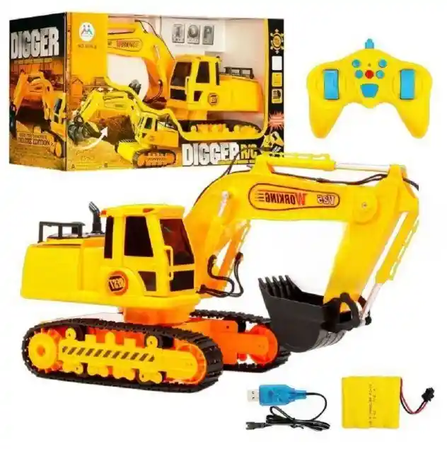 Es un vehículo de construcción con orugas, un cucharón funcional y un control remoto inalámbrico, diseñado para que los niños simulen la operación de maquinaria de construcción real. Características principales: Funcionalidad Completa: Se puede mover hacia adelante, atrás, girar a la izquierda y a la derecha. El brazo y el cucharón son funcionales y se pueden controlar para cavar y levantar, imitando los movimientos de una excavadora real. Diseño Realista: Cuenta con orugas de goma (algunos modelos pueden tener piezas de metal en el cucharón para mayor durabilidad) que proporcionan un buen agarre en diversas superficies, como tierra o arena suelta. Control Remoto: Utiliza un control remoto inalámbrico, generalmente de 2.4 GHz, para evitar interferencias con otros juguetes RC. El control permite una variedad de canales, lo que significa que varios movimientos se pueden realizar de forma independiente. Luces y Sonidos: A menudo incorpora luces LED y sonidos de motor realistas para una experiencia de juego más inmersiva. Batería Recargable: El vehículo funciona con una batería recargable (normalmente una batería Li-ion de 3.7V o similar) e incluye un cable de carga USB. El control remoto requiere sus propias pilas AA. Material: Está construido principalmente con plástico ABS resistente, aunque el cucharón o algunas partes de los engranajes pueden ser de aleación de metal en versiones de mayor calidad. Este tipo de juguete ayuda a desarrollar la coordinación mano-ojo y la motricidad fina en los niños mientras aprenden conceptos básicos de ingeniería y construcción a través del juego.
