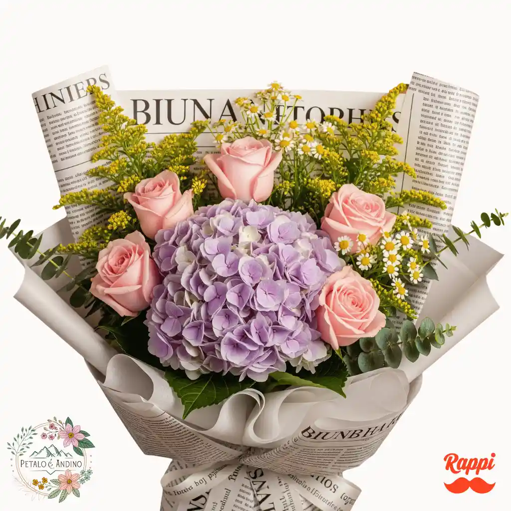 hortensia lila rosas rosadas manzanilla ramitas de solidago ramas de eucalipto