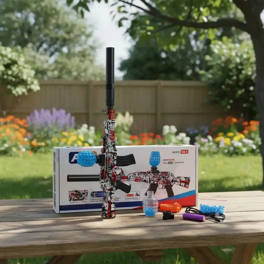 🔫 Rifle de Balas de Gel Eléctrico y Manual A-K – Crystal Bullet Gun El rifle A-K Crystal Bullet Gun combina la acción eléctrica y manual para ofrecer una experiencia de juego más realista y divertida. Su diseño moderno con acabado gráfico tipo graffiti y funcionamiento con batería recargable lo convierten en una excelente opción para quienes disfrutan los juegos de puntería y acción. ✨ Características principales: ⚙️ Modo dual: funcionamiento eléctrico y manual 🔋 Incluye batería recargable y cable USB de carga 📏 Longitud total: 63 cm 💥 Munición: balas de gel de 7-8 mm (crystal bullets) 🎨 Diseño con acabado gráfico colorido 🧰 Accesorios incluidos: silenciador, depósito de balas, balas hidrogel, cargador, batería y cable de carga 📦 Medidas del empaque: 41 x 18 x 6,5 cm 🎯 Beneficios: Favorece la coordinación y puntería Promueve el juego al aire libre Diseño ergonómico y seguro ⚠️ Edad recomendada: Mayores de 12 años