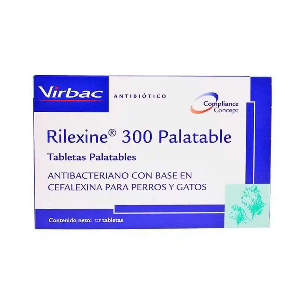 Rilexine 300 es un medicamento antimicrobiano diseñado para el tratamiento eficaz de infecciones cutáneas, urinarias, respiratorias y gastrointestinales en perros y gatos. Este producto contiene Cefalexina, un potente antibiótico que actúa deteniendo el crecimiento de bacterias susceptibles, ayudando a aliviar los síntomas y promover una recuperación más rápida. Rápida acción contra infecciones bacterianas Formulado especialmente para caninos y felinos Disponible en cómodas tabletas de fácil administración Ayuda a reducir inflamación y malestar asociado con varias infecciones Proporciona un tratamiento efectivo para múltiples tipos de infecciones