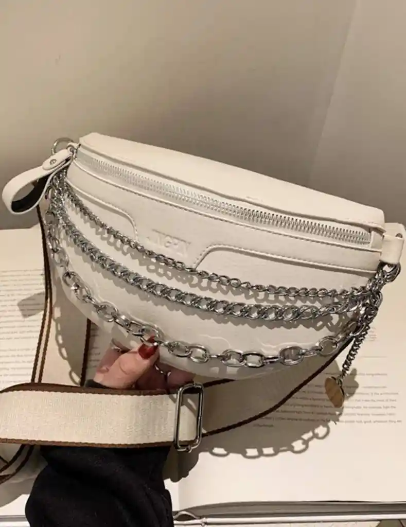 Esta hermosa riñonera es el accesorio perfecto para cualquier tipo de oacasion, ademas de su color tan versatil cuenta con detalles como cadenas que haran resaltar su belleza y una correra graduable para que la uses como desees.
