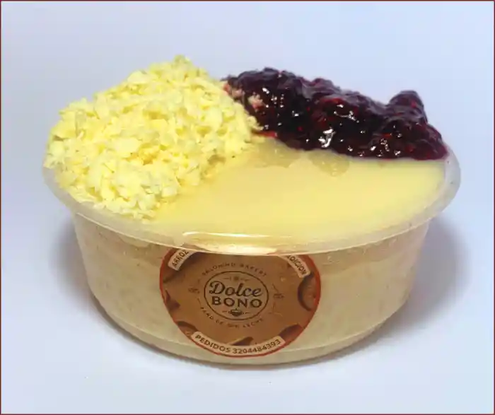 Exquisito y cremoso arroz de leche de la abuela acompañado de salsa de queso fresco, salsa de moras artesanal y leche condensada