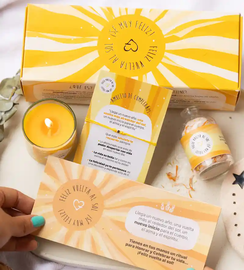 Es un ritual para comenzar un nuevo año de vida AGRADECIENDO y MANIFESTANDO tus sueños y anhelos. Es un ritual para abrirte a NUEVOS COMIENZOS, NUEVOS CICLOS Y NUEVAS ENERGÍAS... Al encender cada vela coloca tus intenciones y deseos en ella y envíaselos al universo. ¿QUÉ CONTIENE? Una vela de GRATITUD con aroma a hojas de otoño Manifiesto de Cumpleaños Baño de Sal para limpiar y renovar la energía Actividades de Manifestacion para abrir nuevos comienzos, ciclos y energías. Amuleto de cumpleaños: que representa tu compromiso de vivir al máximo.