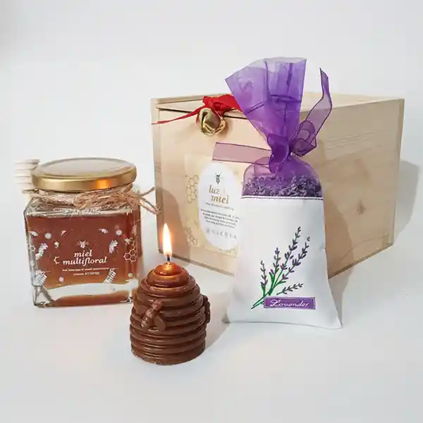 Este kit esta creado para un momento de calma, une la dulzura de la miel de abejas, el aroma relajante de la lavanda y la luz cálida de la vela de cera de abejas para crear un ritual de bienestar y conexión. Además, puedes usar el sachet de lavanda para hacer infusiones o ambientador para lugares pequeños. Incluye: *Miel 100% natural, traída de apiario santandereano en presentación de 250 ml con cuchara mielera * Sachet de lavanda * Vela en cera de abejas en forma de panal Empaque en caja de madera