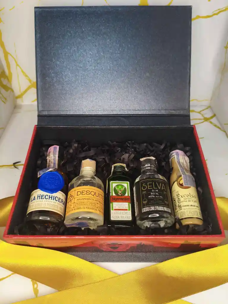 Eleva tus regalos al siguiente nivel con este set de mini licores en un estuche premium que combina elegancia y portabilidad. Ideal para cualquier ocasión: el detalle que todos recordarán. Y para que tu regalo sea 100% tuyo, tienes la opción de solicitar una tarjeta personalizada con foto y mensaje. Simplemente coordínalo por mensaje interno al confirmar tu compra. Contiene: Licor Jägermeister 20 ml Crema de Cafe Excelso 50 ml Ginebra Selva Gin 50 ml Aguardiente Desquite 50 ml Ron La Hechicera 50 ml