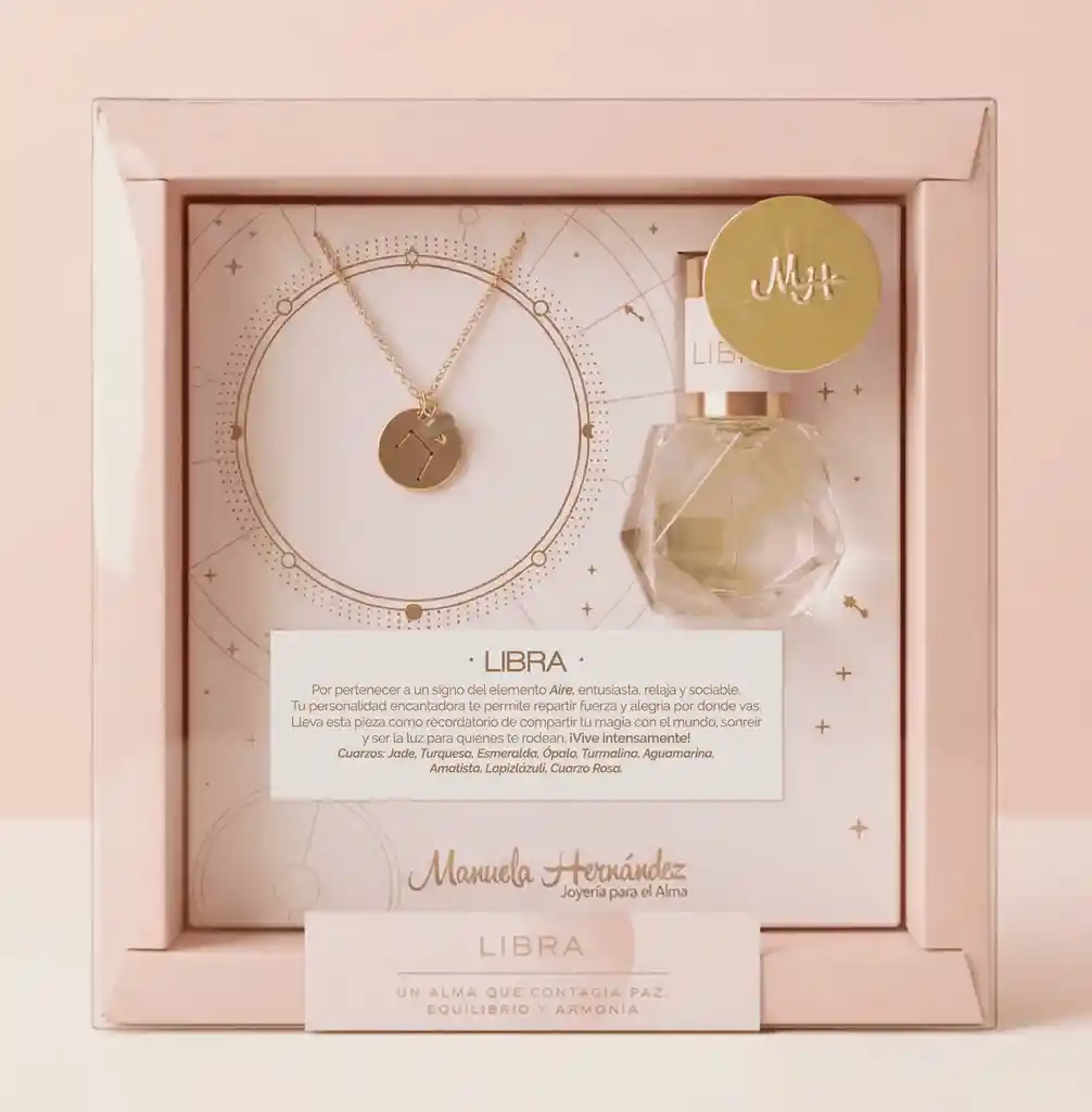 Ritual Zodiacal Libra 🌙✨ Un tesoro con significado para conectar con tu energía o regalar: cadena bañada en oro 18K con la constelación de tu signo, cuarzo natural alineado a tu zodiaco y blend de aceites esenciales para intencionar, armonizar y atraer lo que deseas. 💫 ¿Qué trae tu Ritual? -Cadena bañada en oro 18K con dije de la constelación de tu signo zodiacal acompañado de un cuarzo natural que vibra con la energía de cada signo. Longitud de la cadena: 45cm -Blend de aceites esenciales inspirado en tu zodiaco, para aromatizar, intencionar y llevar contigo siempre. (10ml)