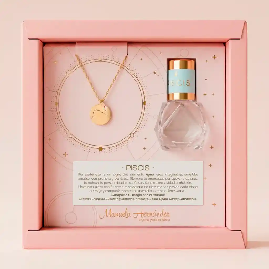 Ritual Zodiacal Piscis 🌙✨ Un tesoro con significado para conectar con tu energía o regalar: cadena bañada en oro 18K con la constelación de tu signo, cuarzo natural alineado a tu zodiaco y blend de aceites esenciales para intencionar, armonizar y atraer lo que deseas. 💫 ¿Qué trae tu Ritual? -Cadena bañada en oro 18K con dije de la constelación de tu signo zodiacal acompañado de un cuarzo natural que vibra con la energía de cada signo -Blend de aceites esenciales inspirado en tu zodiaco, para aromatizar, intencionar y llevar contigo siempre. (10ml)