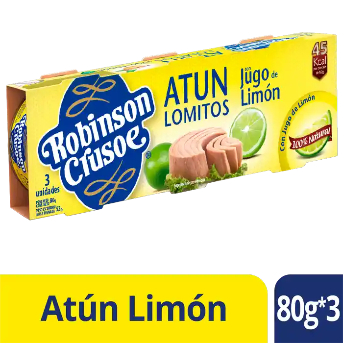 Atún 100 % natural con jugo de limón, rico en vitaminas del grupo B: B2, B3, B6, B9 y B12. Ideal para consumir en sándwich, ensaladas o tortillas. Presentación X 3 unidades de 80 g c/u.