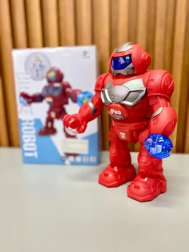 Robot Musical con Luz y Movimiento Color: rojo llamativo. Material resistente y seguro para niños. Emite luces brillantes, reproduce música y se mueve solo. Funciona con 3 pilas (no incluidas). Tamaño compacto: 10 × 7 cm. Ideal para estimular la coordinación y la curiosidad de los pequeños.