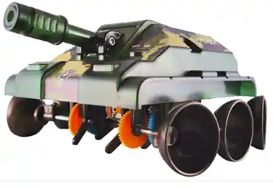 Elaborado en Polietileno De Medidas de alto 8 cms x Ancho 14 cms x Largo 16 cms Construye tu tanque y diseña emocionantes batallas donde se involucren la habilidad en el manejo y la puntería para no quedar fuera del combate. El tanque te permite avanzar, retroceder, girar a la izquierda, derecha y disparar. Pulsando el botón de disparo el tanque activa el emisor infrarrojo de su cañón, el cual lanza una señal que si es detectada por un contrincante será asumida como un impacto, produciendo que realice dos círculos y emita un sonido, uno de los leds verdes se apagara indicando que se perdió una de las vidas, si es alcanzado 4 veces quedara fuera de competencia.