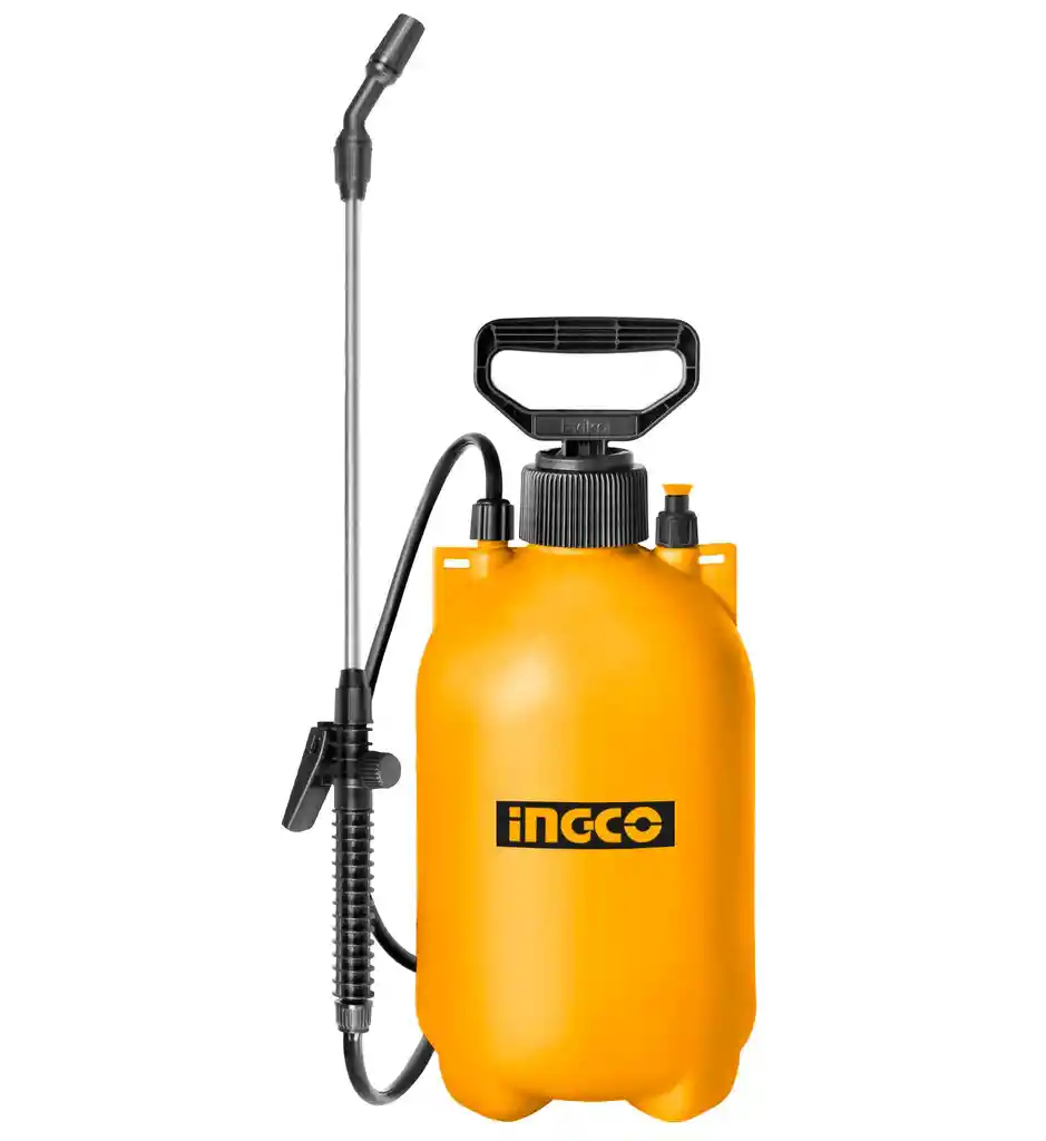 5L Válvula de liberación de presión de seguridad Práctico asa de transporte Palanca de bomba de aluminio fuerte Presión: 2.5BAR Manguera flexible de 1,2 m de longitud Lanza inoxidable y boquilla de plástico. Gatillo ON/OFF con bloqueo de gatillo Patrón de rociador ajustable niebla a corriente Embalado por caja de color