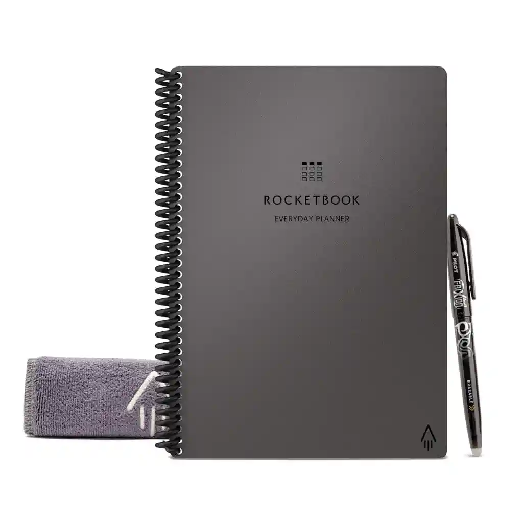 El Everyday Planner es el primer planificador libre de culpa de la galaxia. Con plantillas minimalistas y páginas sin fecha, esta agenda se adapta completamente a tu estilo de planificación, lo que significa que puedes saltarte días, semanas o meses sin juzgarte ni perder páginas. Al igual que otros cuadernos Rocketbook, esta agenda funciona con la aplicación Rocketbook para guardar copias digitales de tus planes, compartir notas y crear listas de control digitales. Escribe con cualquier bolígrafo Pilot FriXion y luego borra como por arte de magia tus páginas con agua para reutilizar el Everyday Planner hasta 2080. Sabemos que tienes planes, ¡ahora ponte a ello! Tamaño ejecutivo: 17 cm x 22 cm / 48 páginas 48 páginas reutilizables con 8 tipos de páginas diferentes Incluye páginas de planificación semanal, mensual y anual, además de plantillas para el seguimiento de proyectos, tareas pendientes y toma de notas. Las páginas del calendario sin fecha se adaptan a tu estilo de planificación y reducen el sentimiento de culpa de la agenda. Funciona con cualquier bolígrafo, marcador o resaltador Pilot FriXion para una escritura suave. Las páginas se borran con agua y con el paño de microfibra incluido para reutilizarlas sin cesar. La aplicación Rocketbook escanea y envía tus notas a la nube para organizarlas y compartirlas digitalmente.