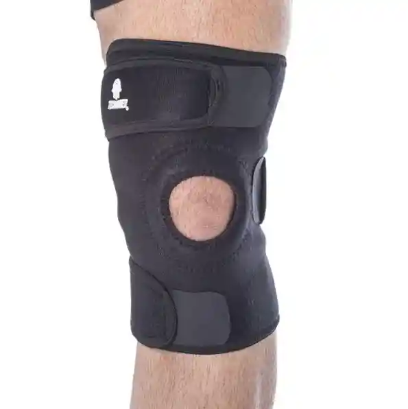 Rodillera estabilizadora de neopreno con rotula abierta, estabilizadores laterales en espiral, cinchas de sujeción y rodete rotuliano