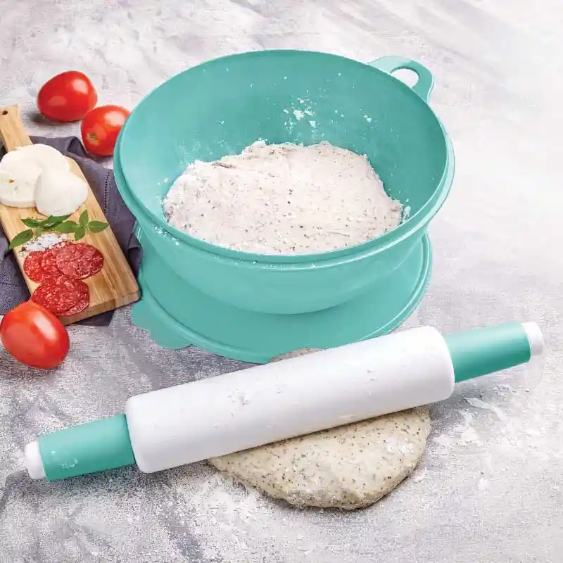 El Rodillo Tupperware te permite amasar de manera más fácil ya que el deslizamiento es continuo. ¡Los extremos giratorios, facilitan el movimiento y la acción de amasar! A través de uno de sus extremos llena de agua el Rodillo con agua fría o tibia para trabajar las diferentes masas y aumentar el peso del Rodillo para amasar fácilmente. Dimensiones 46.2 cm de largo · Ø 8 cm.