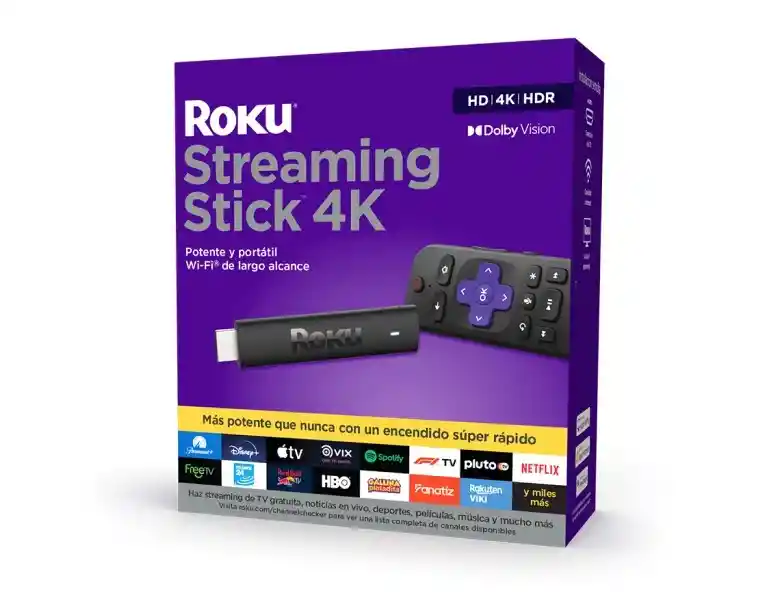 Roku® Streaming Stick® 4K es más rápido y potente que nunca. El receptor Wi-Fi® rediseñado de largo alcance está supercargado con hasta 2 veces la velocidad, exactamente lo que necesitas para una transmisión fluida en espectacular imagen 4K, Dolby Vision® y HDR10+. El nuevo diseño se conecta directamente a tu televisor con una configuración sencilla. Es perfecto para televisores montados en la pared y mantener los cables fuera de la vista. Imagen 4K increíblemente nítida que saca el rico detalle en tu entretenimiento con 4 veces la resolución de HD. Mira asombrado como los colores cobran vida con la espectacular imagen Dolby Vision®. Comienza a transmitir canales como Disney+, Prime Video, HBO Max, Apple TV+, Netflix, Sling y Hulu en un instante con un arranque superrápido, y disfruta de una transmisión de TV fluida en habitaciones más lejos de tu router con el receptor Wi-Fi de largo alcance, ahora hasta 2 veces más rápido. Enciende tu televisor, ajusta el volumen y controla tu dispositivo Roku con un mando a distancia. Busca fácilmente en miles de canales con tu voz y controla tu TV, transmisión y sonido, todo con el control remoto de voz Roku incluido. Actualiza tu transmisión con una gran selección de TV gratuita, en vivo y premium, incluyendo Roku® Originals solo en The Roku Channel
