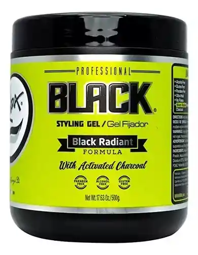 Gel de peinado de color negro para cabello oscuro; proporciona una fuerte sujeción y un tinte de color temporal para el cabello; la fórmula Black Radiance incluye carbón activado