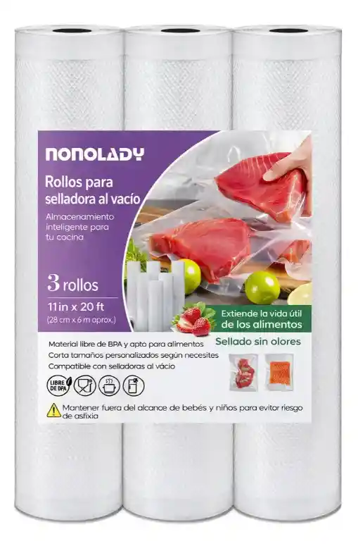 AL0000002193 MATERIALES SEGUROS SIN BPA Fabricadas con material multicapa resistente y libre de BPA que cumple con normas de seguridad alimentaria. No contiene toxinas y permite conservar alimentos de forma más segura. Soporta temperaturas adecuadas para hervir y cocinar al vacío, siendo ideal para congelar, preparar comidas o almacenar alimentos secos y líquidos. TAMAÑO PERSONALIZABLE Y MAYOR VERSATILIDAD Cada rollo permite cortar la bolsa al tamaño necesario, adaptándose a porciones pequeñas, medianas o grandes. Incluye 3 rollos de aprox. 20 cm × 6 m, cada uno, ofreciendo una longitud total de aproximadamente 18 metros para uso frecuente y flexible. CONSERVACIÓN PROLONGADA DE LOS ALIMENTOS La tecnología de sellado hermético ayuda a mantener los alimentos frescos por mucho más tiempo que las bolsas convencionales. Su textura en relieve permite una extracción de aire eficiente, reduciendo la oxidación y evitando quemaduras por congelación. ALTA RESISTENCIA Y PROTECCIÓN CONTRA PINCHAZOS El material grueso y texturizado proporciona mayor resistencia al desgarro y perforación, incluso con alimentos con huesos o bordes afilados. Su construcción reforzada crea una barrera eficaz contra el aire, la humedad y los olores. COMPATIBILIDAD UNIVERSAL CON SELLADORAS Diseñadas para funcionar con la mayoría de selladoras al vacío del mercado, incluyendo máquinas tipo FoodSaver, selladoras externas, de cámara o equipos sous vide. Perfectas para uso doméstico o comercial en cocina. ESPECIFICACIONES TÉCNICAS CLAVE Ancho del rollo: 20 cm (8 pulgadas) Longitud por rollo: 6 m (20 pies) Cantidad: 3 rollos Longitud total: 18 m (60 pies) Material: Multicapa texturizado Libre de BPA: Sí Uso: Congelador, sous vide, almacenamiento de alimentos Compatibilidad: Selladoras al vacío universales INCLUYE: 3 rollos de bolsas para sellado al vacío (20 cm × 6 m cada uno)