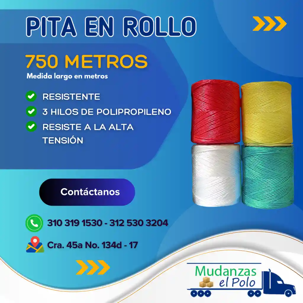* Fibra sintética de múltiples usos, colores surtidos, 1 unidad x 750 metros. * Resistente para amarre * Calidad Garantizada Contáctanos: 310 319 1530 - Ubicación: Cr. 45a No. 134d - 17 Bogotá D.C