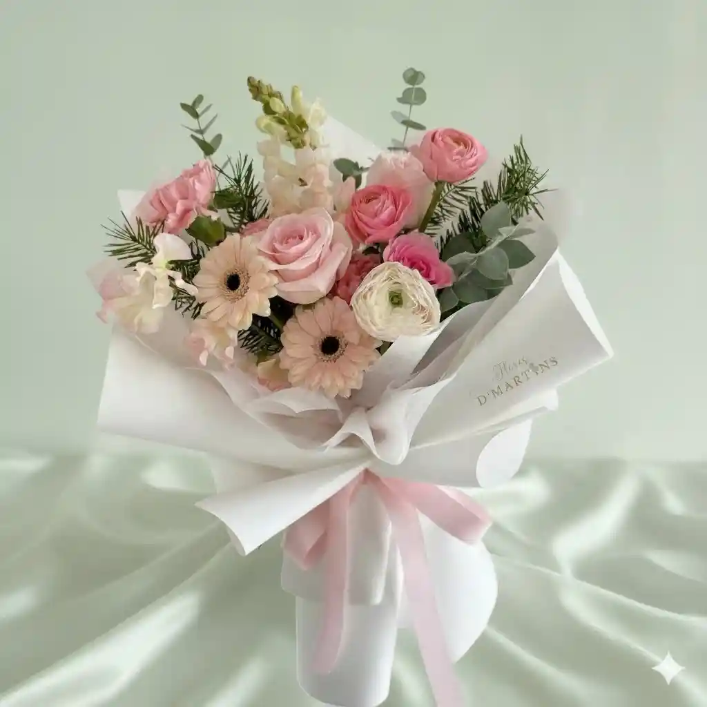 Evoca la delicadeza del bouquet y su potencial para expresar sentimientos profundos, ideal para ocasiones especiales como aniversarios, propuestas o detalles inesperados.- Rosas rosadas: símbolo de ternura, gratitud y afecto. Su color suave transmite calma y delicadeza. - Gerberas en tono rosa pálido: representan alegría y pureza. Su forma radiante aporta frescura y dinamismo al arreglo. - Ranúnculos blancos: asociados con la elegancia y el encanto. Sus pétalos múltiples crean una textura sofisticada y romántica"