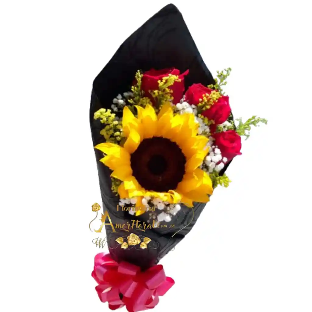 bouquet por 3 rosas, 1 girasol, papel decorativo, moño y tarjeta con mensaje, si deseas un mensaje para la tarjeta lo puedes dejar escrito en el área de observaciones o escribirnos al whatsapp al 3143111616 y enviarnos el mensaje para la tarjeta.