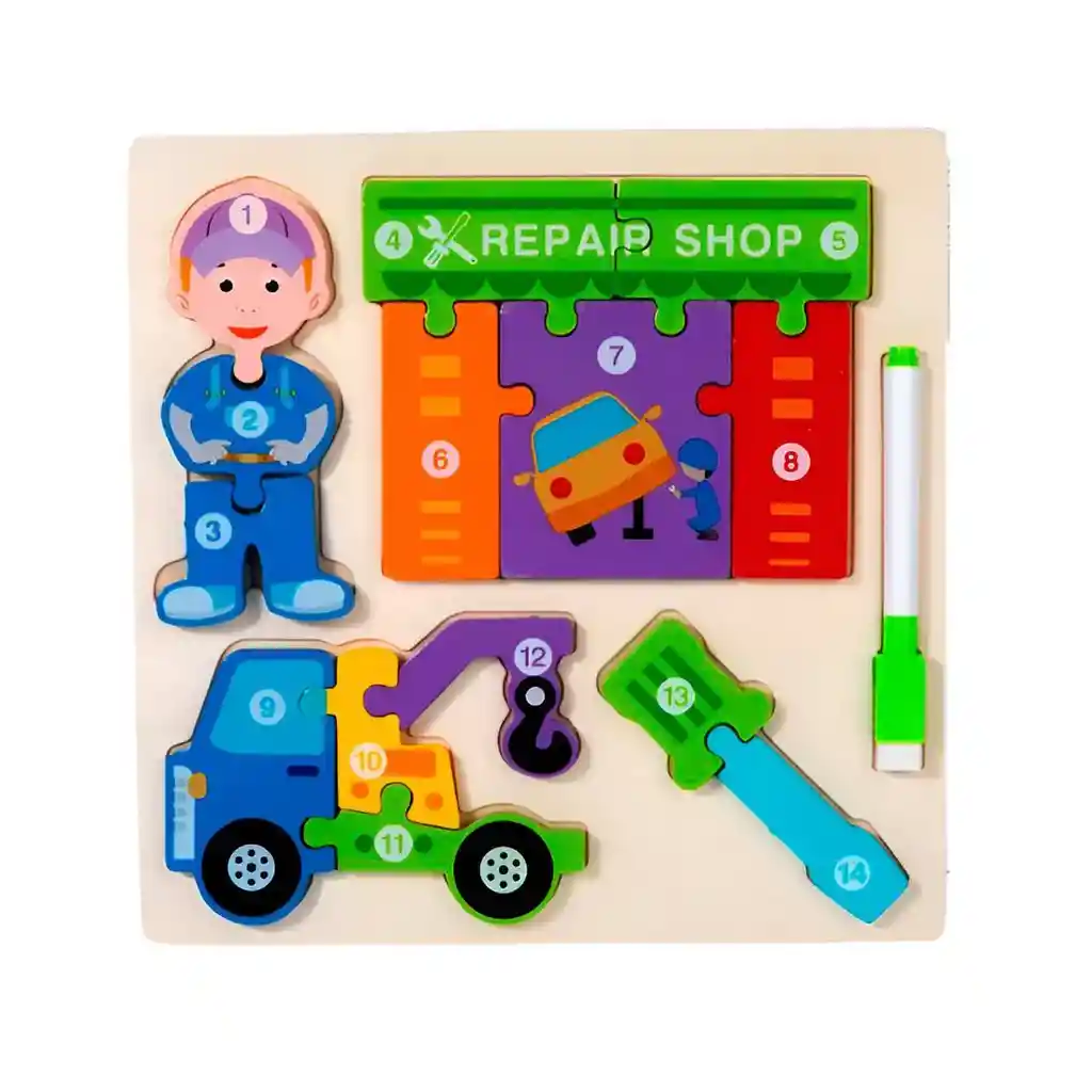 ¡Prepara a tu pequeño para una misión de aprendizaje y diversión con este increíble tablero de actividades 4 en 1! Este juguete de madera de alta calidad invita a los niños a explorar y armar cuatro fascinantes rompecabezas que representan a un valiente profesional junto a su moderno equipo de trabajo, como sus vehículos y herramientas de exploración. Cada pieza está ingeniosamente numerada, permitiendo que los más pequeños practiquen el conteo y la secuencia numérica mientras desarrollan su motricidad fina y habilidades para resolver problemas. Al terminar, la aventura continúa: solo hay que darle la vuelta al tablero para descubrir una pizarra blanca, perfecta para dibujar, practicar letras y dar rienda suelta a la creatividad con el marcador borrable incluido. Es la herramienta todo-en-uno ideal para combinar el pensamiento lógico con la expresión artística en horas de juego inteligente. Ficha Técnica: Dimensiones: 22 cm x 22 cm x 2 cm Material: Madera Edad recomendada: + 3 años Referencia: DM1278 Certificado de conformidad: E5-0359-2021 ** _Para defectos de fábrica o retractos: \_Por favor revise el producto apenas lo reciba y antes de usarlo. No aplican ley de retracto o defectos de fábrica luego de usar el producto. Se manejan máximo 5 días para reportar defectos de fábrica (por ejemplo, producto funciona mal, piezas faltantes, rotas, etc). Para hacer efectiva la devolución el producto debe devolverse con el empaque original, el cual debe estar en buen estado, incluir todos los documentos y las partes completas y sin daños.